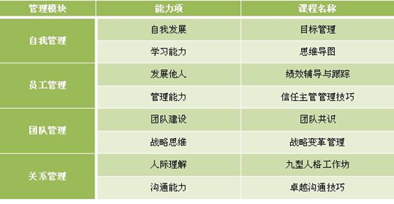 管理類課程體系和軟性技能相關,主要包括自我管理、員工管理、團隊管理和關系管理四大模塊。