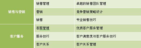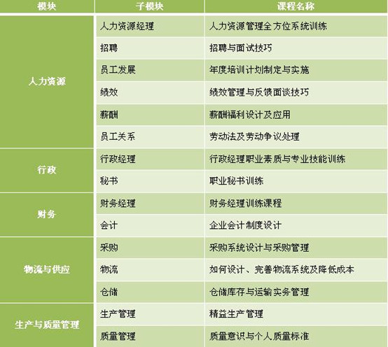 公司各個組織單元下的職能可以進行進一步的細分,根據(jù)細分的職能就可以確定專業(yè)方向上的培訓課程體系。人力資源單元可以分為人力資源管理、招聘、員工發(fā)展、績效、薪酬、員工關系;行政單元可以分為行政管理、秘書;財務單元可以分為財務管理、會計、審計;物流與供應單元可以分為采購、物流、倉儲;生產(chǎn)與質(zhì)量管理單元可以分為生產(chǎn)管理、現(xiàn)場管理、流程管理、質(zhì)量管理、過程管理;銷售與營銷單元可以分為銷售團隊管理、營銷、銷售、市場;客戶服務單元可以分為客服管理系統(tǒng)、客戶服務、客戶關系。以下為專業(yè)類課程體系部分部分內(nèi)容: