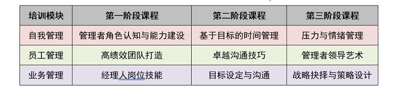 2、課程設(shè)置中高層管理者培訓(xùn)集中在“自我管理”、“員工管理”、“業(yè)務(wù)管理”三個(gè)維度,每個(gè)管理維度都有相對(duì)應(yīng)的能力素質(zhì)模塊,據(jù)此設(shè)置針對(duì)性課程,具體見(jiàn)表1-3。